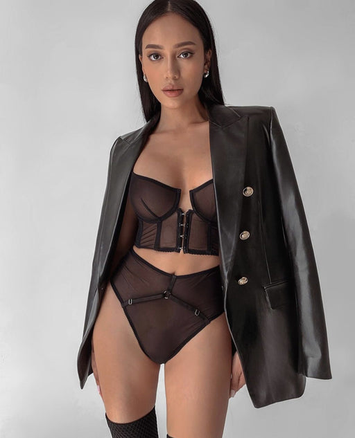 Lingerie set made of soft and stretchy semi-transparent mesh fabric. The set includes a corset bra, Brazilian-style panties and adjustable garters....