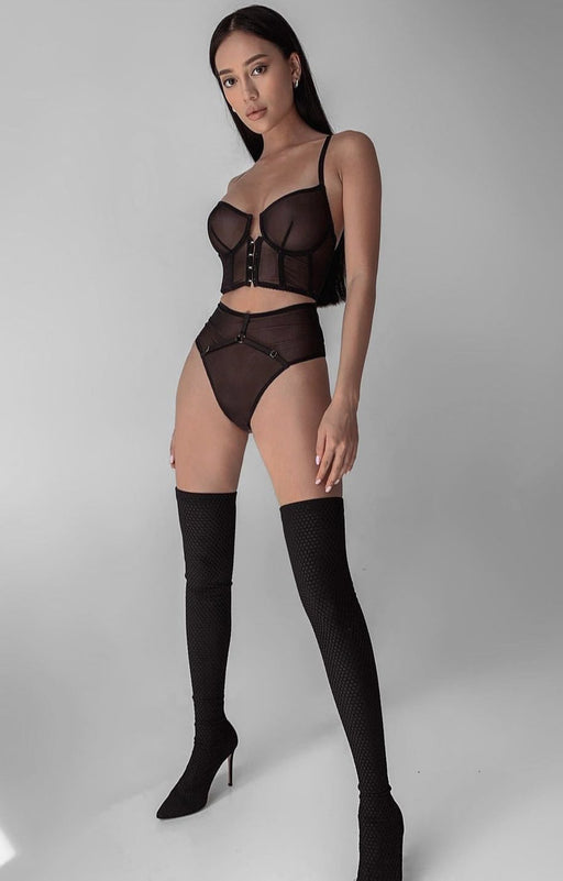 Black mesh lingerie set with decorative straps. Set includes a corset bra and briefs. Lingerie set is made of soft and stretchy semi-transparent me...