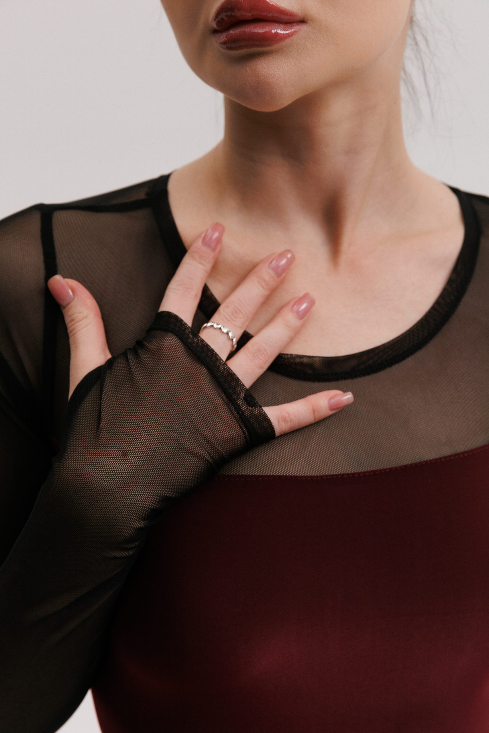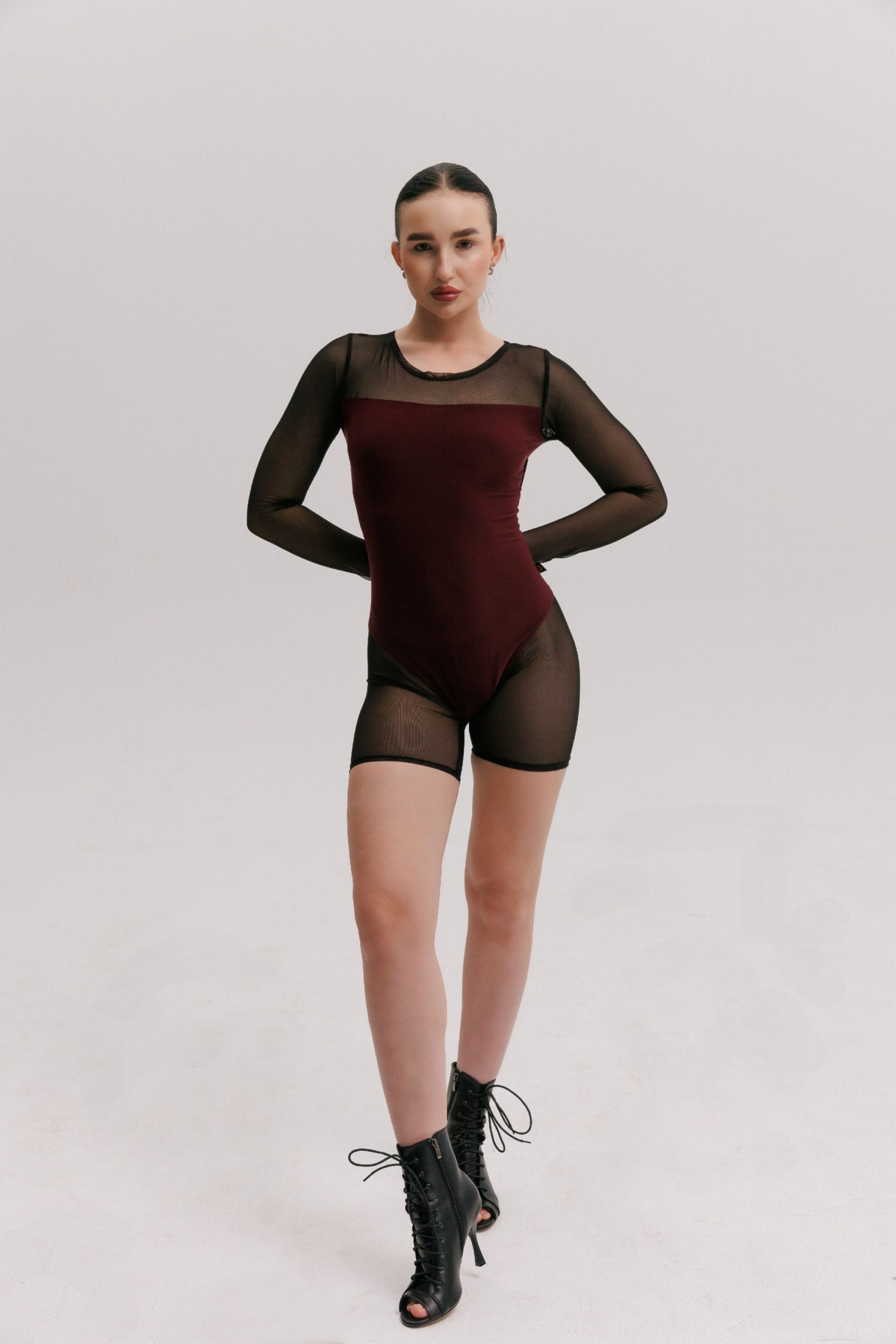 Our stunning bordeaux jumpsuit with long sleeves, mesh inserts, bodysuit illusion, and a captivating back cutout exudes elegance and sensuality, making it a must-have addition to your dance wardrobe.