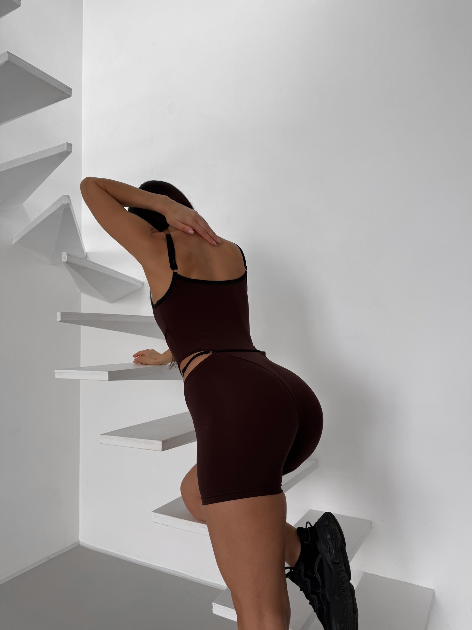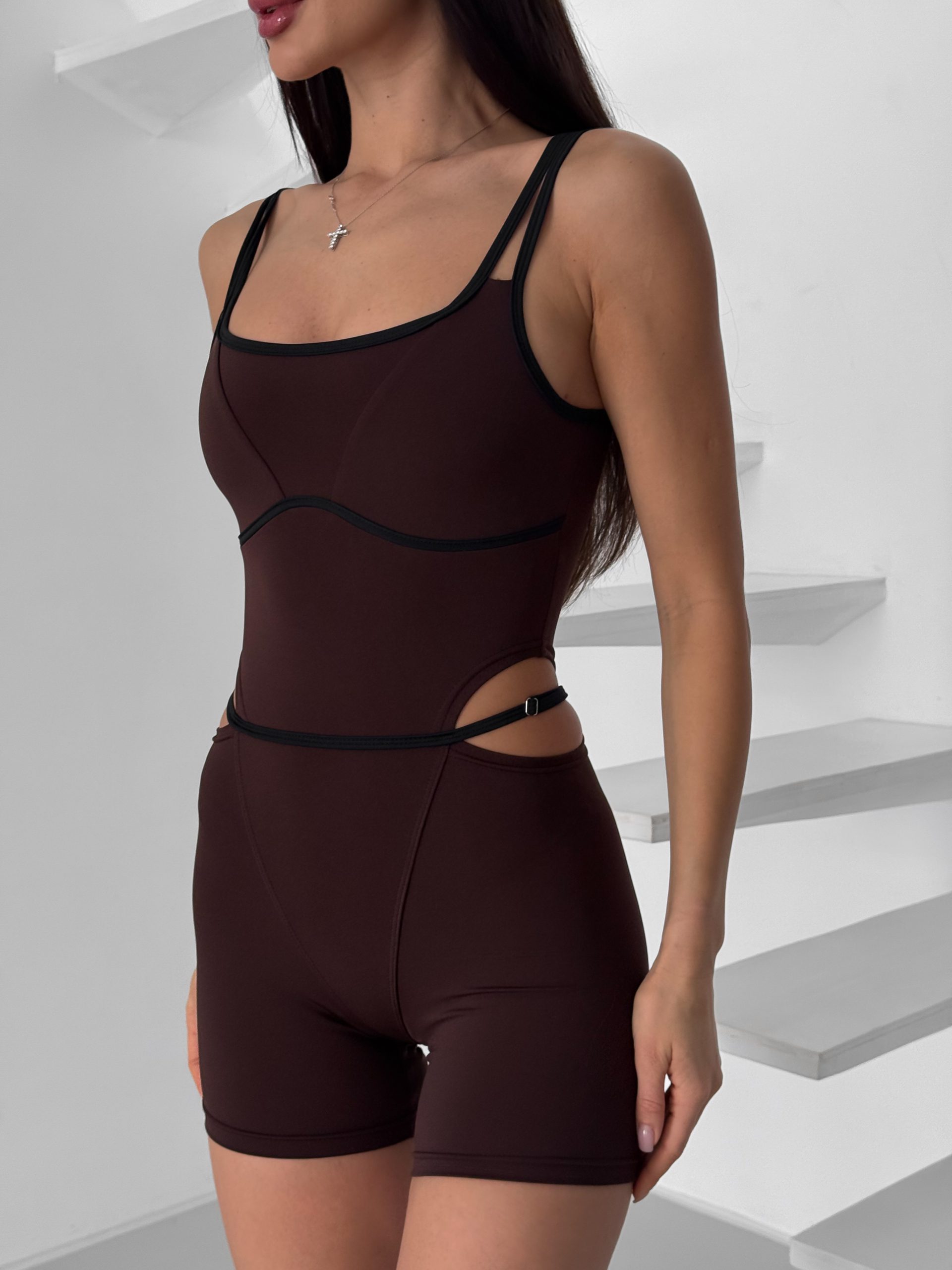 The playsuit is made of elastic lycra, a high-quality and elastic material. Lycra is fade-resistant, withstands numerous washes, feels comfortable against the skin, and remains not see-through during squats. The playsuit includes pockets for bra cup inserts, the cups themselves can be added upon request. The belt is easy adjustable around the waist.