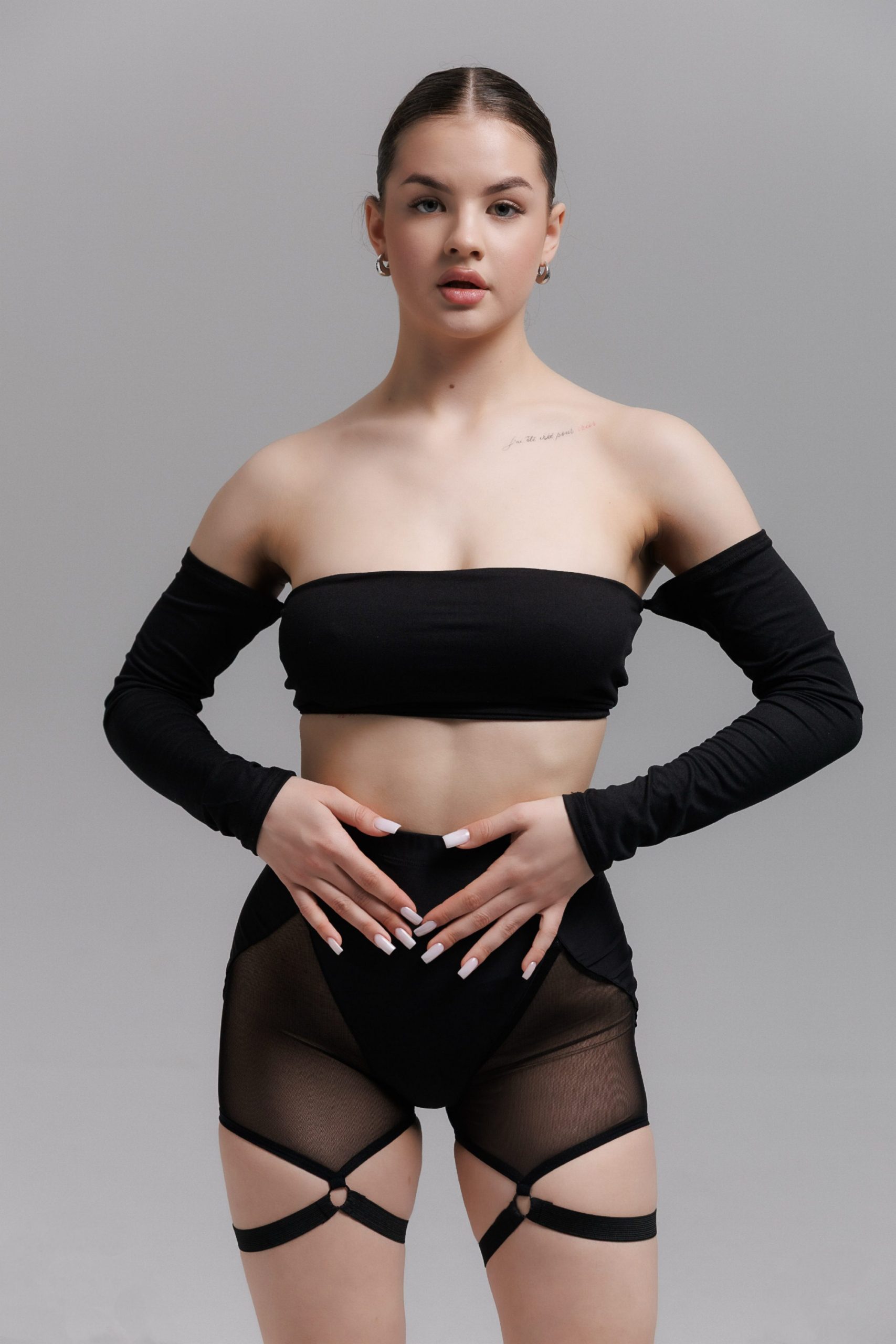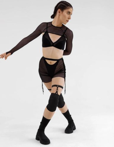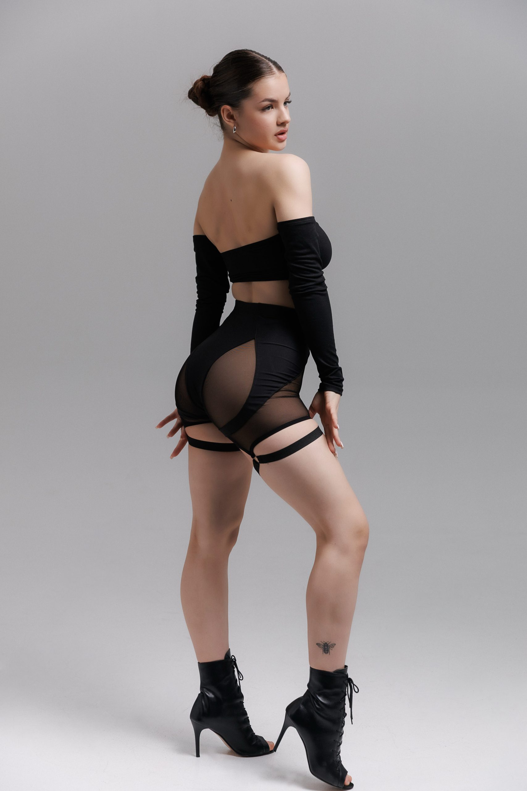 Stylish black shorts that combine creative design with functionality, ensuring full freedom of movement during training. The classic black color adds elegance and edge to your look, making them perfect for performances, classes, or photoshoots.