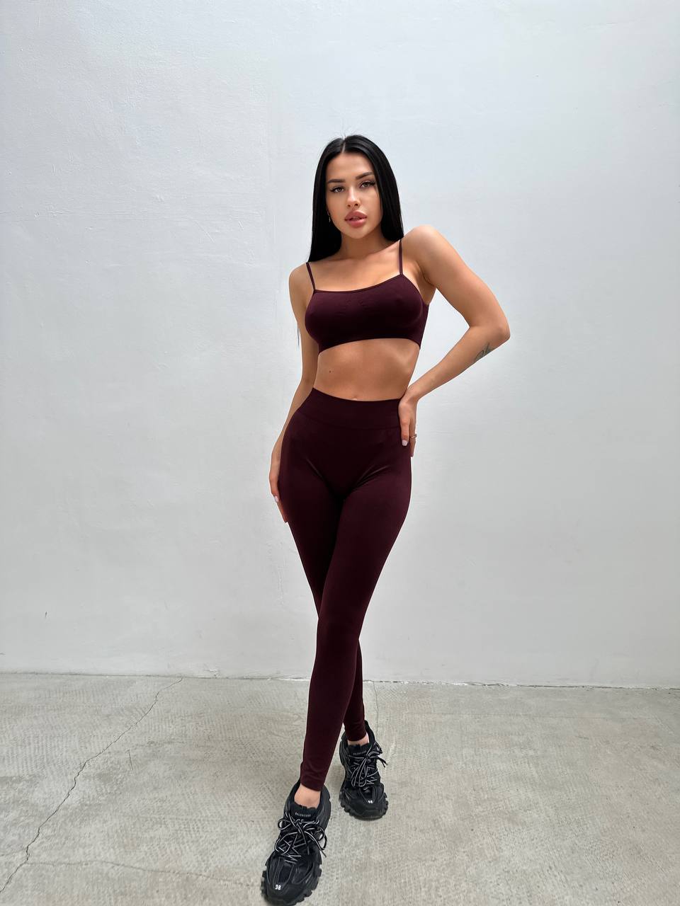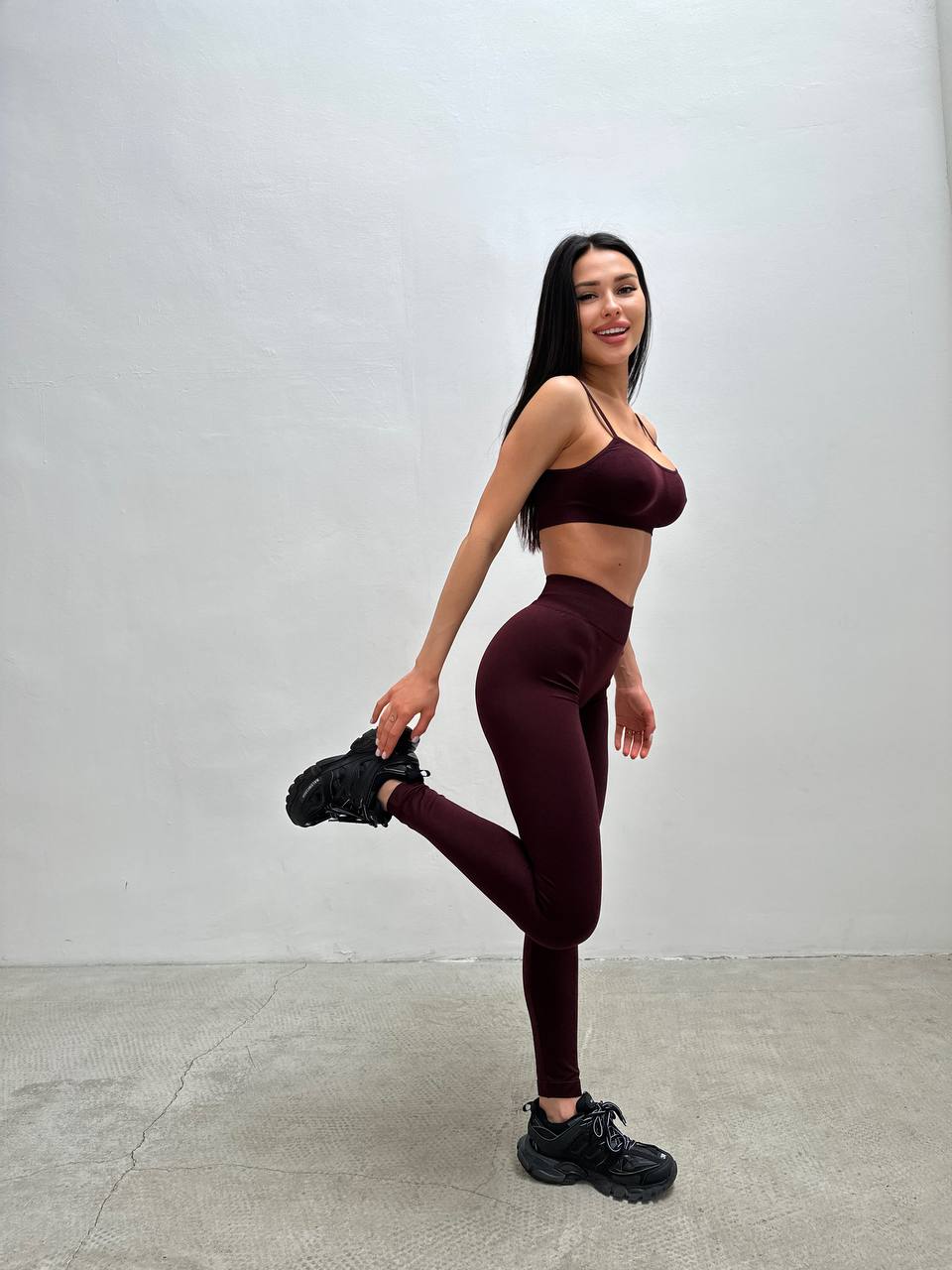 Combine with Bordeaux seamless crop top or turtleneck to get a perfect Co-ord set for your workouts. Add jacket, sneakers or even high heels to create a perfect Sporty Glam look! And don’t forget about seamless underwear.