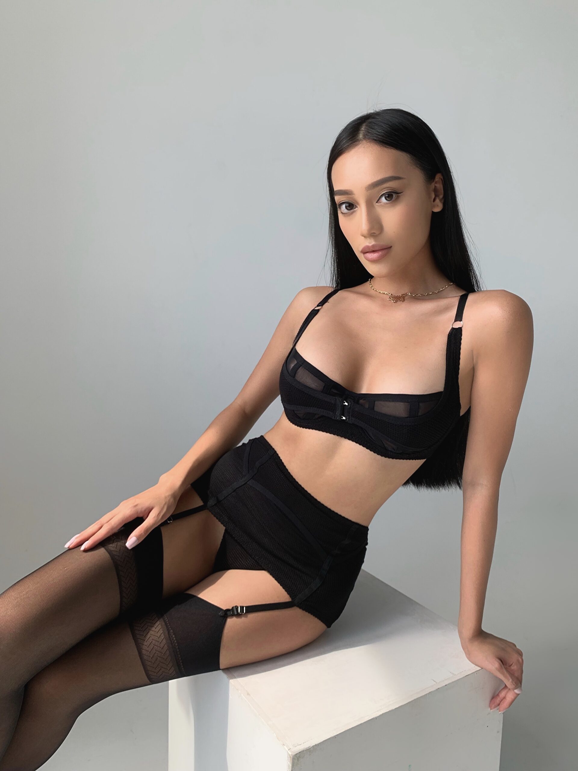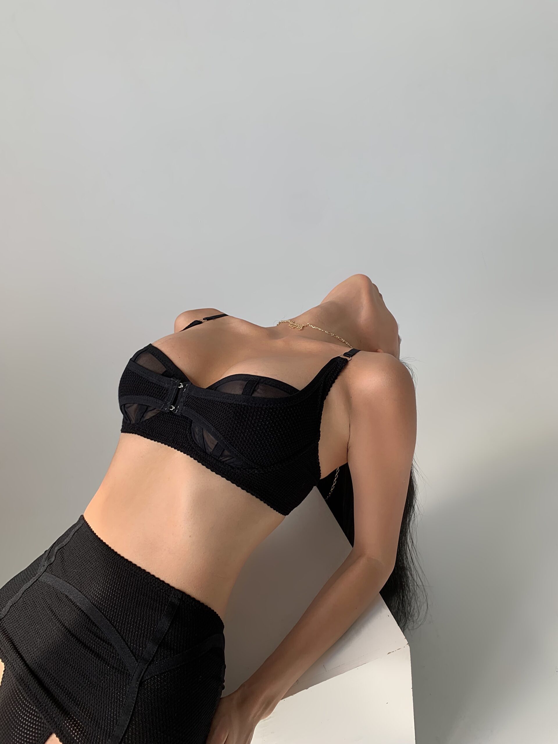 Mustast võrkkangast pesukomplekt seelikutaolise vööga. Komplekti kuuluvad rinnahoidja, reguleeritava suurusega tangad ja seelikutaoline sukavöö.