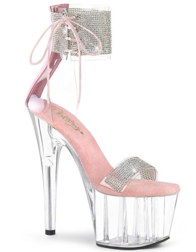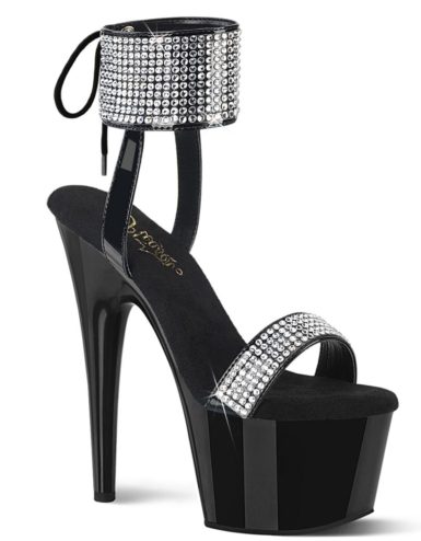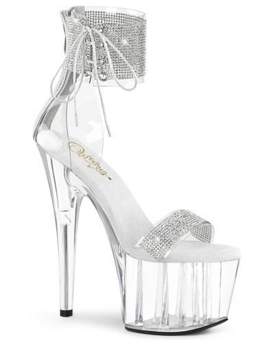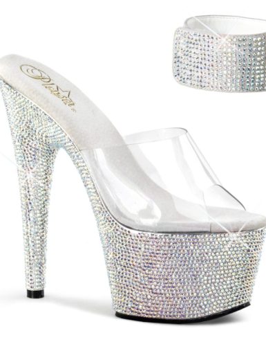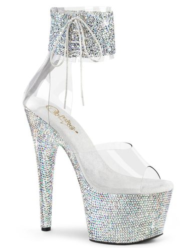 €220.007″ (178mm) Heel, 2 3/4″ (70mm) Platform Close Back Multi Rhinestone Embellished Ankle Cuff Sandal w/Side Lacing Featuring Silver AB Rhinestones Encrusted All-Over the Entire Platform Bottom, Back Zip Closure.