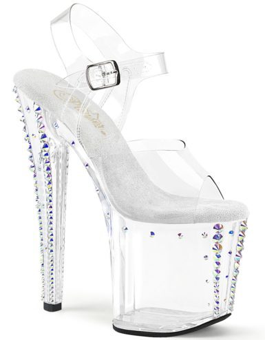 €130.008″ (195mm) Heel, 3 3/4″ (95mm) Platform w/ Prismatic Linear Design at the Platform Front and Back of Heel Featuring AB Rhinestone Cone Studs on the Platform Front & Outer Side of the Platform Bottom & Heel. Suitable for Pole dance, Frame Up, Strip dance, Exotic dance classes, competition, photoshoot.