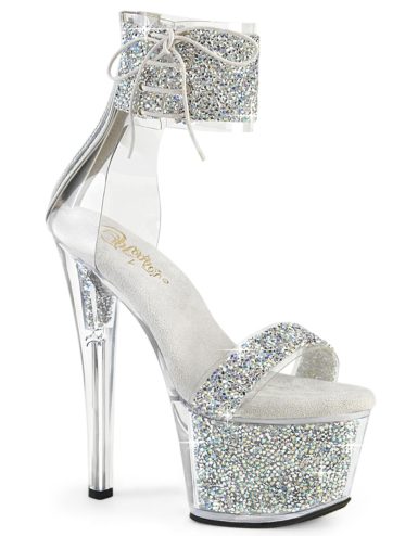 €130.007″ (178mm) Heel, 2 3/4″ (70mm) Platform Close Back Ankle Cuff Sandal w/Side Lacing Featuring Silver Multi Rhinestone Embellished Ankle Cuff & Toe Strap and Inserted in the Platform Bottom, Back Zip Closure. Dance shoes don’t have to be dull! These sandals seamlessly blend style and functionality, ensuring you look as good as you feel.