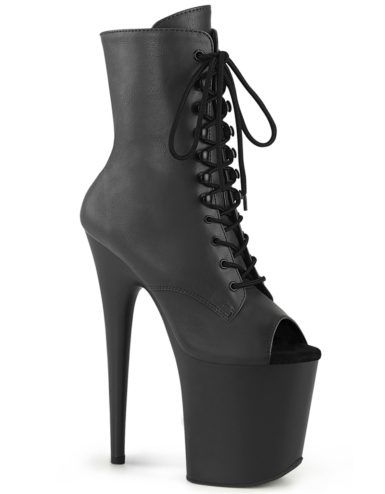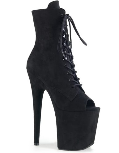 €145.008″ (20 cm) Heel, 4″ (10 cm) Platform Black Faux Suede Peep-toe Ankle Boots – the ultimate fusion of style and performance for pole dancers.