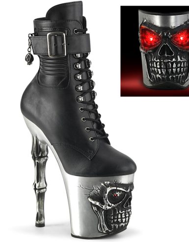 €185.008″ (200mm) Finger Bone Heel, 4″ (100mm) Skull Sculpted Platform Lace-Up Front Ankle Boot Featuring USB Chargeable Red LED Lights w/ Multiple Static/ Changing Patterns in the Eyes of the Skull & Back of Heel, Outside Zip Closureed Pocket and Mini Skull Charms, Inner Side Zip Closure.