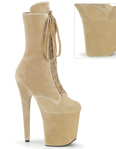€140.00Cream Velvet 8″ (200mm) Heel, 4″ (100mm) Platform O-Ring Lace-Up Front Ankle Boot Featuring Fully Wrapped Platform Bottom, Inner Side Zip Closure. Includes a Pair of Matching Boot Protectors.