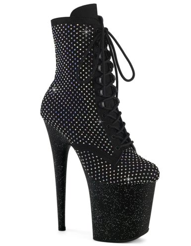 €165.008″ (200mm) Heel, 4″ (100mm) Platform Lace-Up Front Ankle Boot Featuring AB Rhinestone Mesh Overlay Upper and Mini Iridescent Glitters All Over the Entire Platform Bottom, Inner Side Zip Closure.
