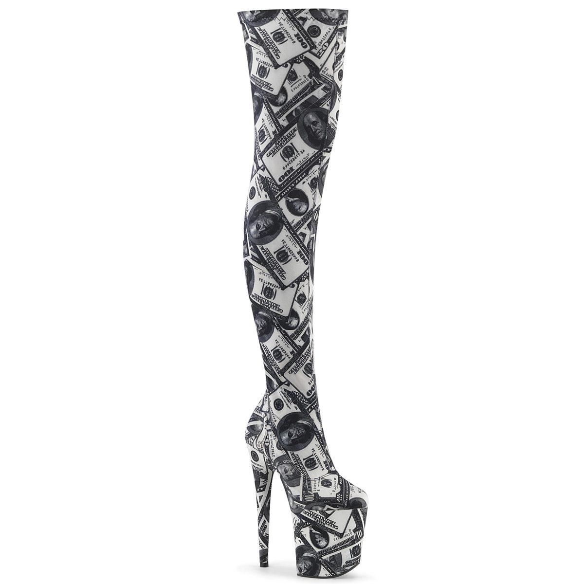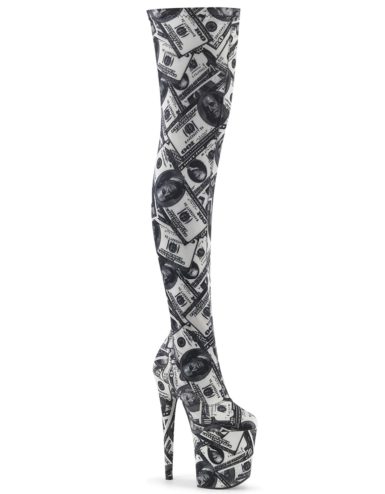 Original price was: €150.00.€120.00Current price is: €120.00.8″ (200mm) Heel, 4″ (100mm) Platform Stretch Thigh High Boot Featuring Dollar Print Upper and Matching Print Wrapped Platform Bottom, Full-Length Inner Side Zip Closure.