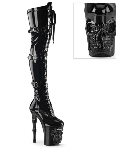 8″ (200mm) Finger Bone Heel, 4″ (100mm) Skull Sculpted Platform Ribbon Lace-Up Front Triple Buckle Strap Stretch Thigh High Boot, Full-Length Inner Side Zip Closure Suitable for Pole dance, Frame Up, Strip dance, Exotic dance classes, competition, photoshoot.