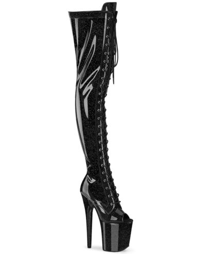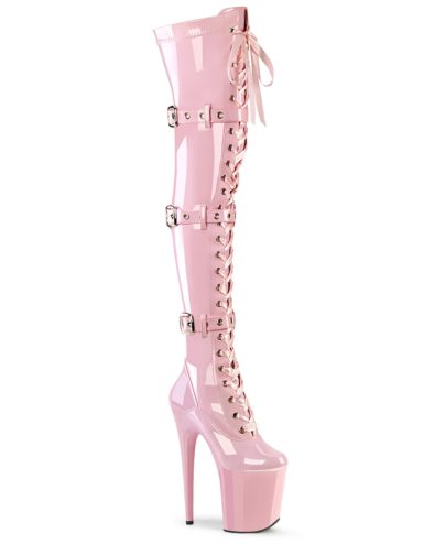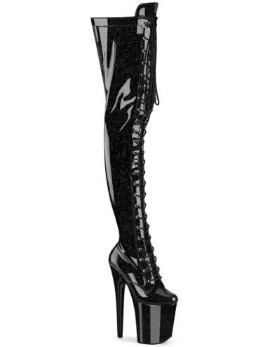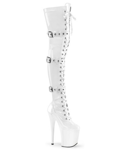 8″ (20.3cm) Stiletto Heel, 4″ (10.2cm) Platform Ribbon Lace-Up Triple Buckle Strap Stretch Thigh High Boot, Full Inner Side Zip Closure. Suitable for Pole dance, Frame Up, Strip dance, Exotic dance classes, competition, photoshoot.