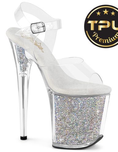 8″ (200mm) Heel, 4″ (100mm) Platform Ankle Strap Sandal Featuring Clear Soft TPU Upper with Rounded & Smooth Edges, Glass Crystal Rhinestone Embellishments on Upper and Silver Glitter Inserts in the Platfrom Bottom & Heel.