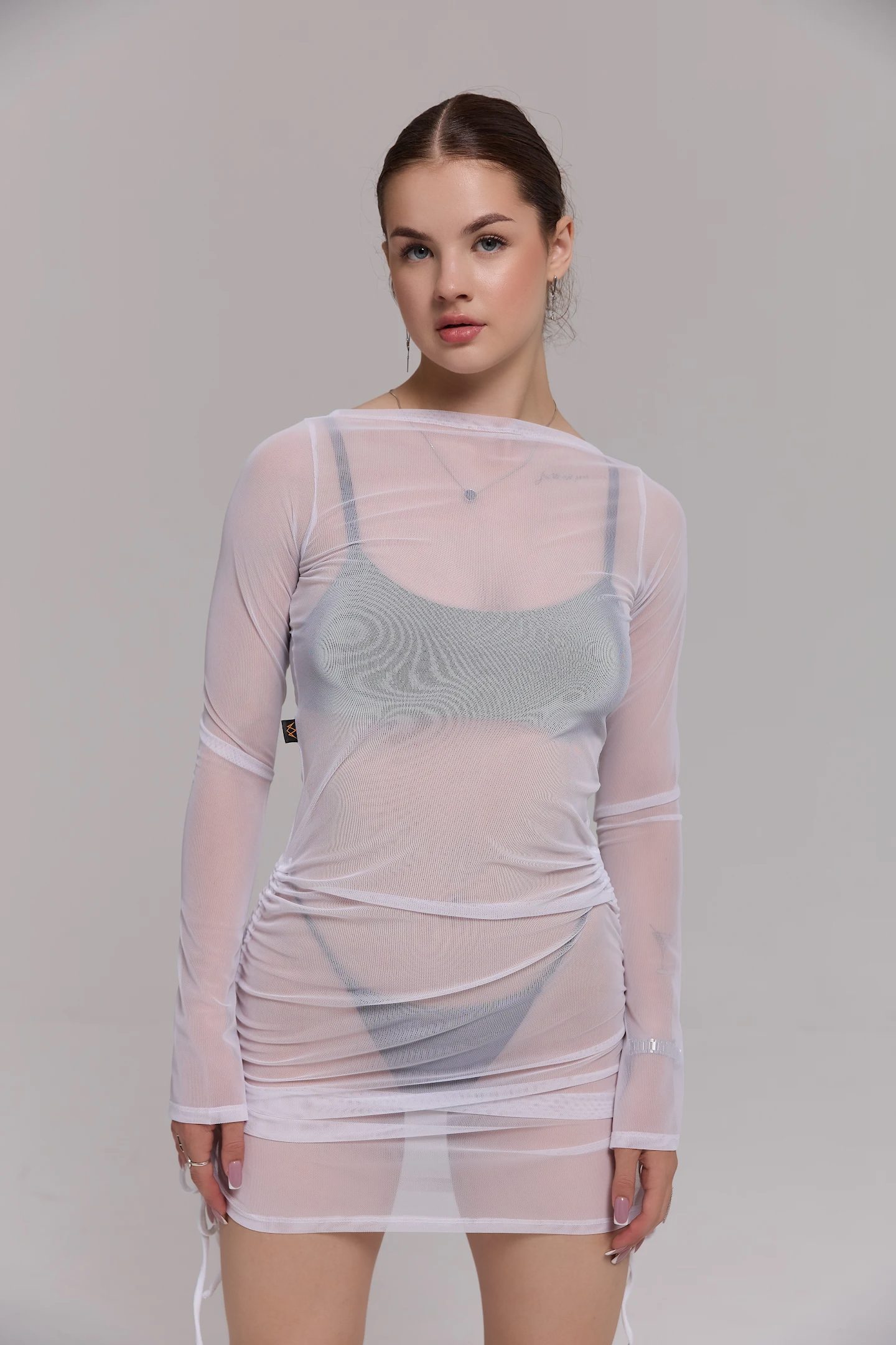 Лёгкая «дышащая» сетка мягко обнимает тело, а регулируемые боковые завязки позволяют играть со стилем и длиной от игривой драпировки до эффектного драматичного силуэта.