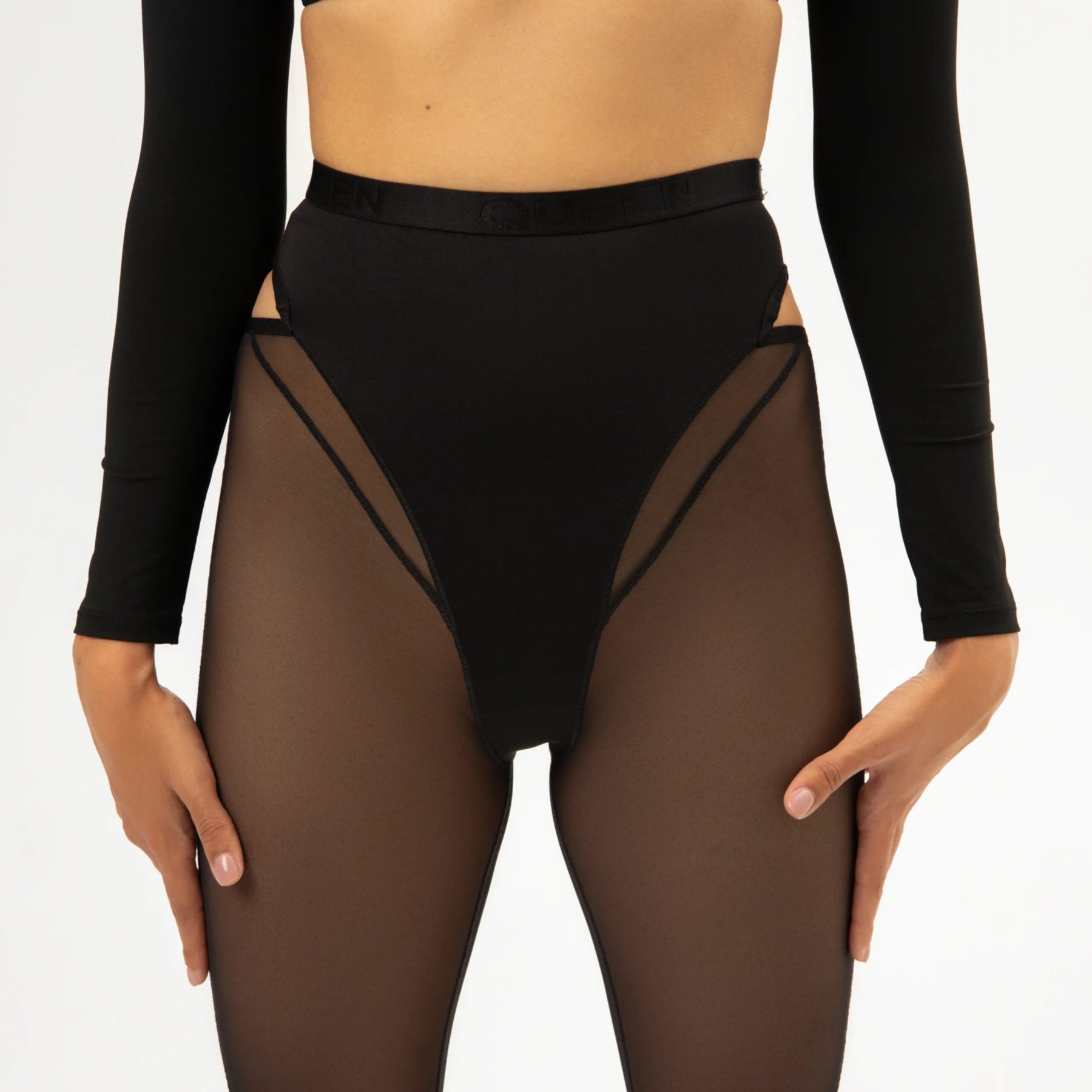 Полупрозрачные лосины с вырезами и завышенной талией выполнены из мягкой и устойчивой к износу сетки. Данный материал хорошо тянется, но при этом не рвется и не оставляет зацепов и стрелок. Идеально подходят для танцев.
