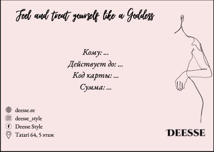 €0.00Электронная подарочная карта Deesse. Для оформления заказа просим связаться с нами — info@deesse.ee